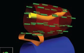 Fig 4. An example of a patient specific three dimensional prostate rendering (red), with rectum (blue), seminal vesicle (orange), individual radioactive seeds (green) and urethra (yellow)